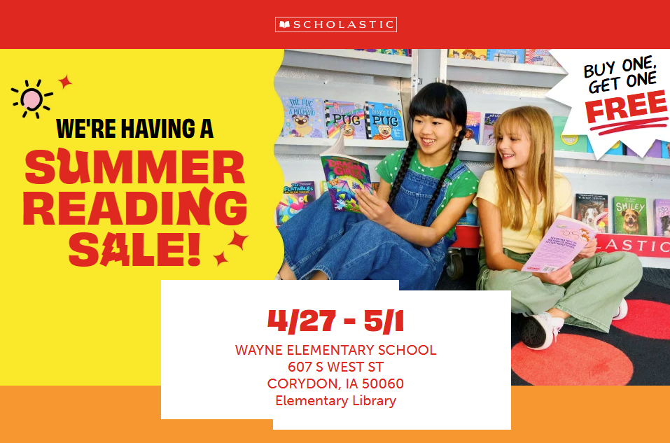 4/27 - 5/1 at the Wayne Elementary LibraryBuy one, get one free!Learn more, set up an eWallet for your student, and shop online at the Scholastic Book Fair website.